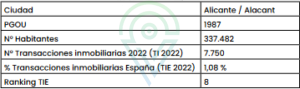 El análisis del suelo urbano vacante en Alicante, con una población de 337,482 habitantes, muestra una distribución diversa de uso del terreno en 2022, con 7,750 transacciones inmobiliarias realizadas.Representa el 1.08% a nivel nacional y colocando al municipio en el puesto 8 en actividad inmobiliaria. En términos de uso de las parcelas, el equipamiento abarca…