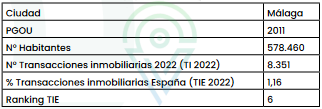 En resumen, el análisis del suelo urbano vacante en Málaga, una ciudad con una población de 578.460 habitantes, 8.351 transacciones inmobiliarias en 2022 y clasificada en el sexto lugar a nivel nacional en términos de volumen de transacciones inmobiliarias, brinda información estratégica para la planificación y el desarrollo urbano sostenible. Al comprender las características y el potencial de estos terrenos, se pueden tomar medidas para aprovechar su uso y promover un crecimiento equilibrado y de calidad en la ciudad.
