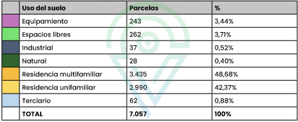 3.44% y el 3.71% de las parcelas, respectivamente. En términos de superficie, el uso residencial multifamiliar ocupa el 37.72% de la superficie total, seguido por el uso residencial unifamiliar con un 21.49%.