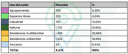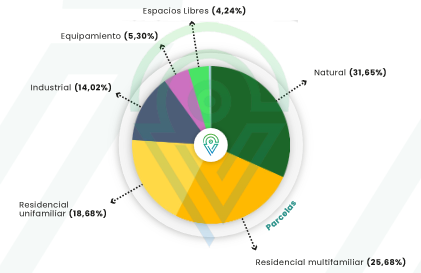 En términos de superficie, el equipamiento ocupa el 1,98% del total. Los espacios libres representan el 4,38% de la superficie, mientras que el uso industrial abarca el 8,58%. El suelo natural, que incluye áreas verdes y espacios naturales, cubre el 82,23% de la superficie. Las áreas residenciales multifamiliares y unifamiliares cubren el 2,04% y el 0,55%, respectivamente. El uso terciario representa el 0,23% de la superficie y está destinado a actividades comerciales y de servicios.